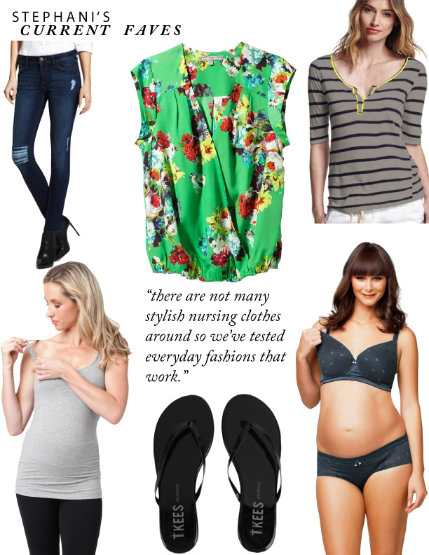Forgiving tops and dresses (loose in the belly), jeggings so you can get the denim look in comfort, a great comfy bottom that is not sweats (right now we are really into printed pants and shorts) and of course, nursing friendly options.