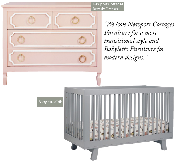 We love Newport Cottages furniture for a more transitional style and Babyletto Furniture for modern designs. Naturepedic is our favorite mattress because they are organic and non-toxic. ECOS paints are our go-to because they are organic as well and VOC free.