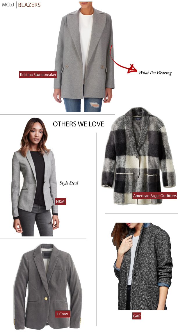 I have been eagerly anticipating this moment… the one when I can wear my cold weather favorites: blazers, boots, leggings and felt hats. This becomes my unofficial cozy chic uniform. The colors and heel heights will change, but the general idea is consistent. And today we are focused on gray blazers inspired by the gorgeous one I am wearing in the picture below. It just so happens that long time good friend Kristina Stonebreaker designed this one. In fact her whole debut collection is fabulous and one I recommend checking out. xx