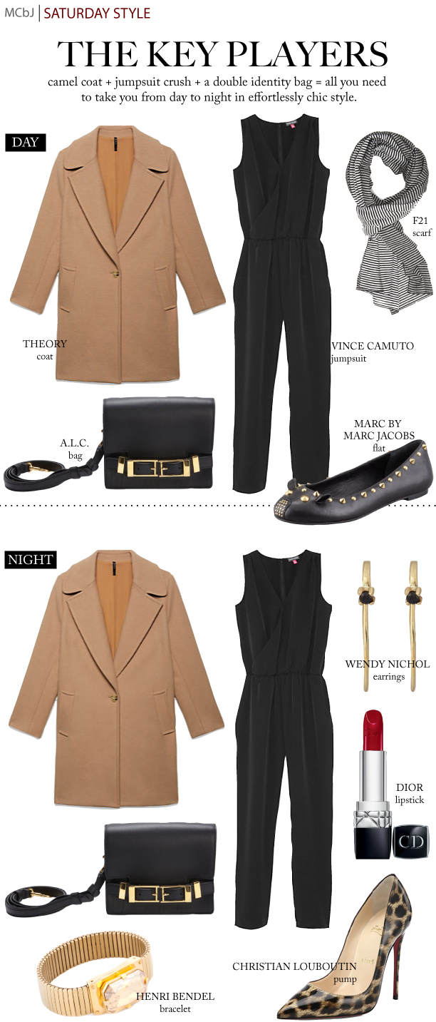 A while back I spotted this gorgeous jacket in the window at Intermix and it has been on my mind ever since. I love the camel color and the way it hangs. This coat (or one similar) adds panache to a day or night look. And paired with a black jumpsuit you can’t go wrong. Perhaps what to love most is the fact that this look can go from day to night by just switching up the shoes, adding some sparkle, and playing up your pout. Plus, this fab bag works as a cross body and a clutch. Truly, practical chic! xx
