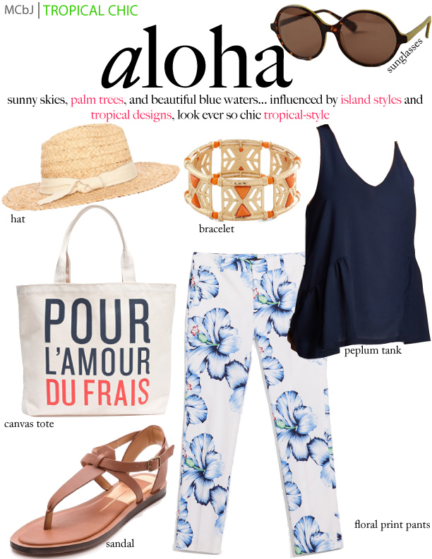 hat // bracelet // sunglasses // peplum tank // floral print pants // canvas tote // sandal