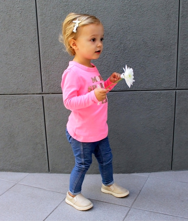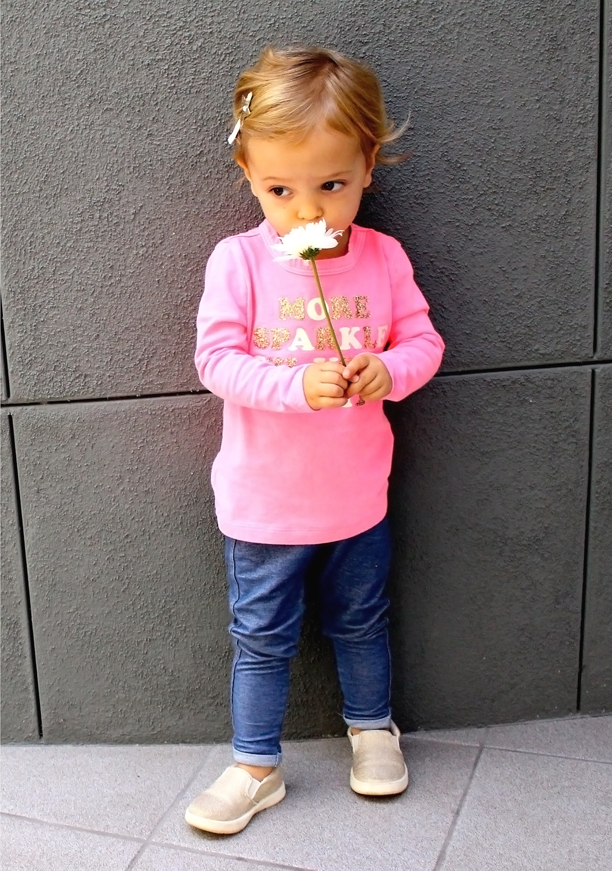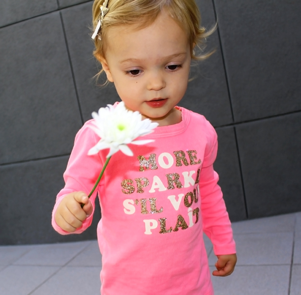 It seems innate in us ladies to love sparkles and flowers. My little Elle Belle is no different as you see here. And yes, this is supposed to be a post of my pregnancy style, but she was wearing this yesterday and I couldn’t resist sharing with you the shopping links for this fabulous tee and metallic slip-ons. Plus, I agree, “More Sparkle Si Vous Plait!” 🙂