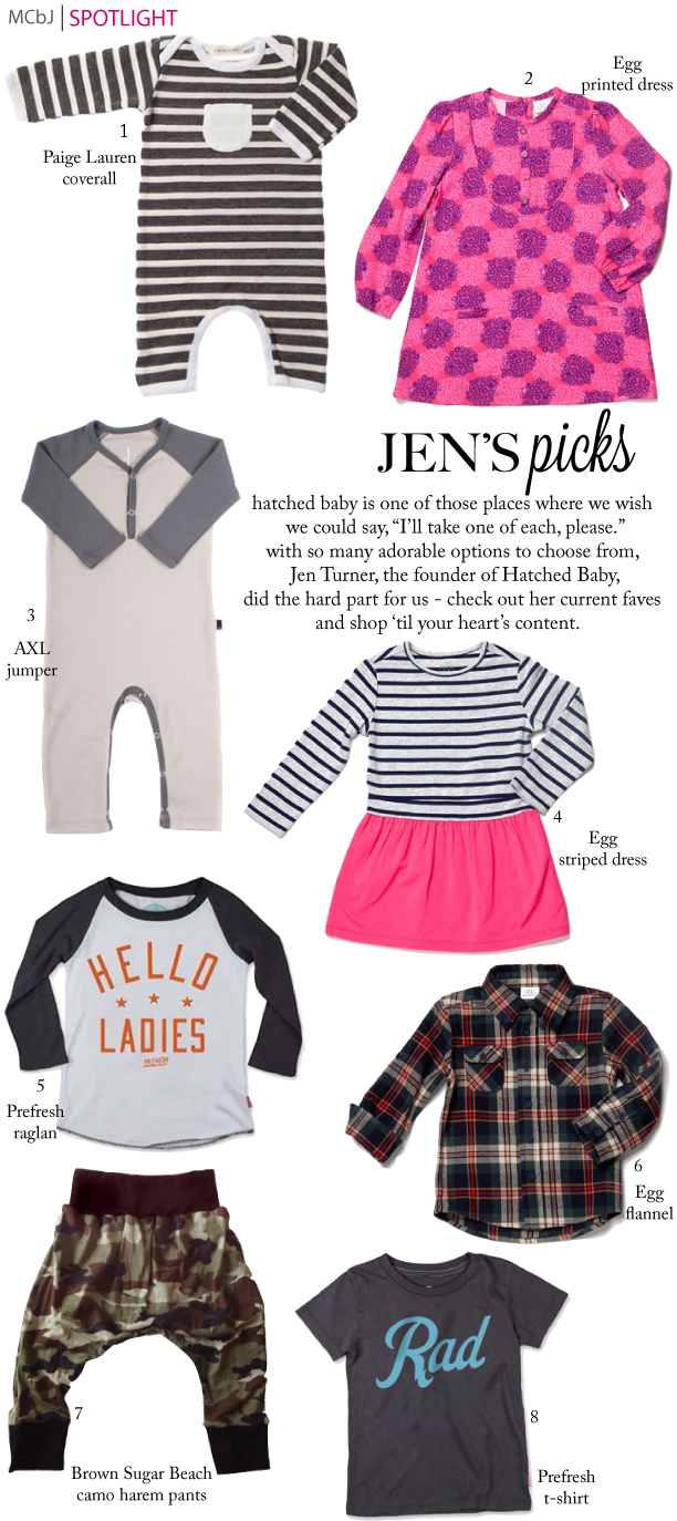 I don’t know about you, but sometimes I get tired of shopping at the same old department store for my children’s clothes… Thus enter Hatched Baby an online store with unique, stylish and well priced clothes for kids and babies. It has quickly become an MCbJ fave and I know it will become one of yours as well. Enjoy this Q & A session with the fabulous owner Jen Turner. Then pop over to her site for a 10 percent discount now through Sunday just for MCbJ readers. Use code: MOMMYCHIC. And can we just say Tres Magnifique! xx