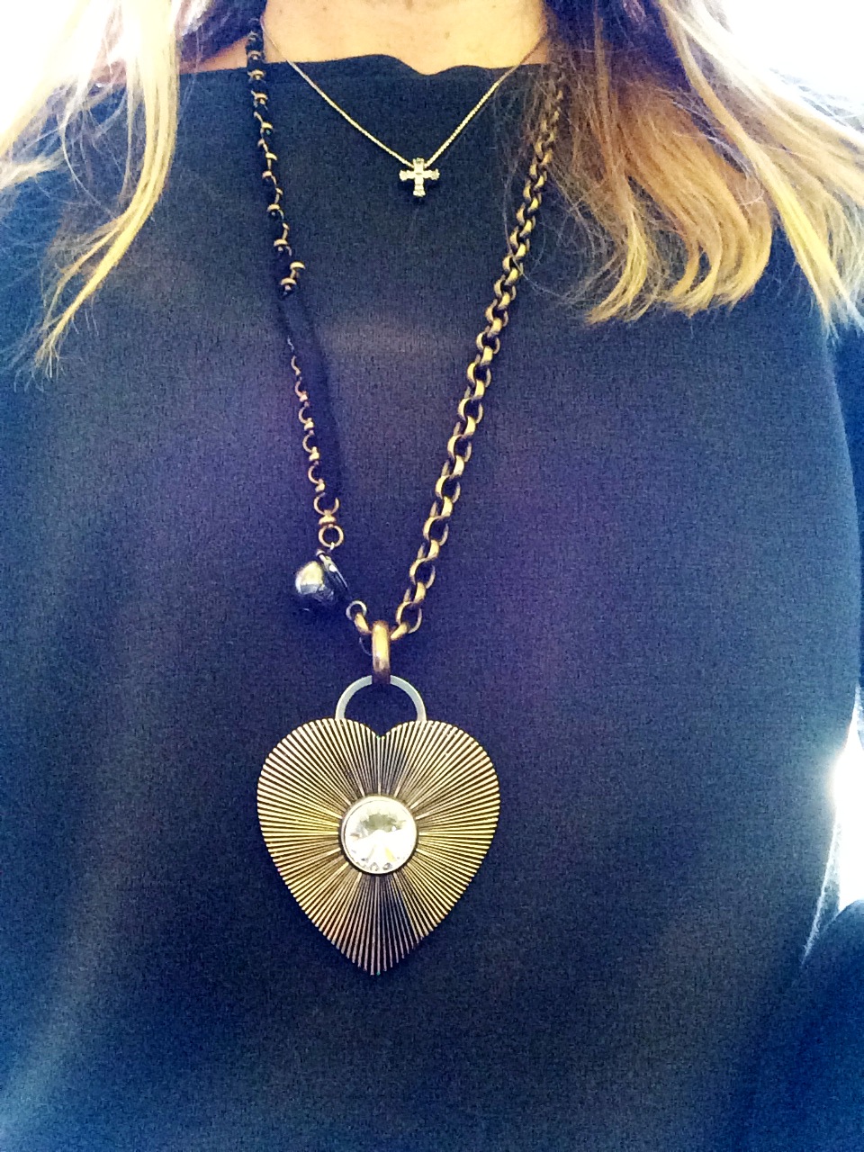 My Lanvin heart necklace that my hubby gave me last Valentine’s Day while in Paris. Tres romantic! ______ Here I am headed out to Chicago for a styling job. I was so sad to leave my family, but these two necklaces gave me some comfort. A little love and faith give me stability in these busy times!