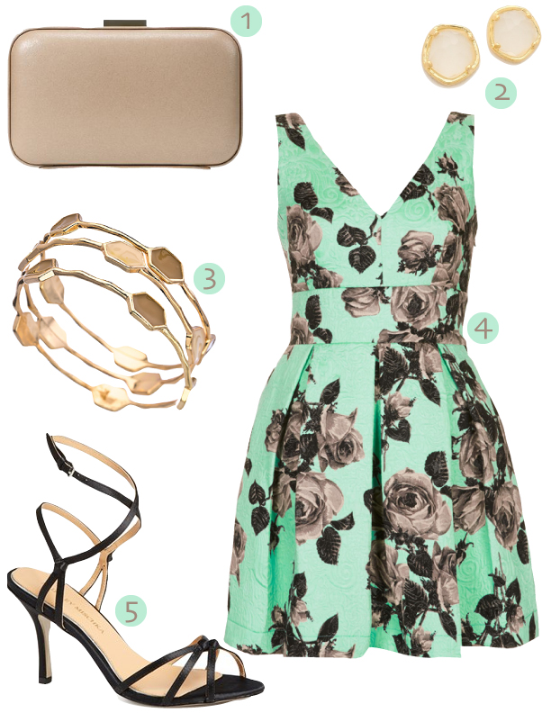 1. Clutch // 2. Earrings // 3. Bangles // 4. Dress // 5. Sandal